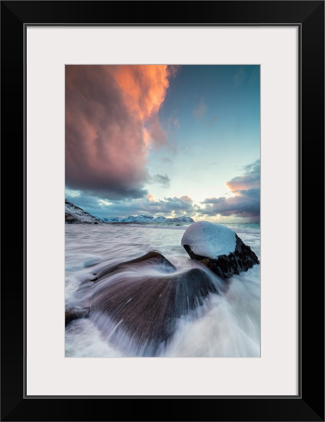 <p>Ice on rocks in the rough sea, Vikten, Flakstad municipality, Lofoten Islands, Norway.</p>