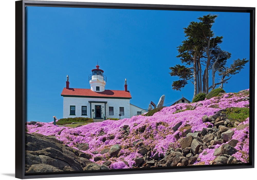 <p>CA, Crescent City, Battery Point Lighthouse, Ice Plants in full bloom.</p>