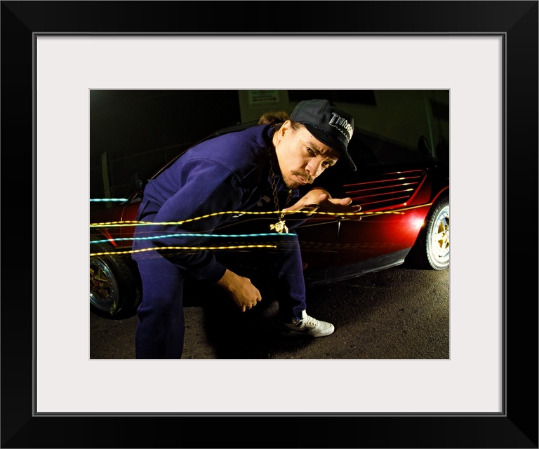 <p>Rapper Ice-T posing with a cherry red car and light trail effects, Los Angeles, 1988.</p>