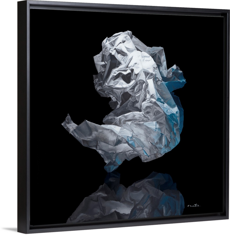 <p>Contemporary vivid realistic still-life painting of a crumpled up piece of tissue paper, on top of a reflective surface.</p>
