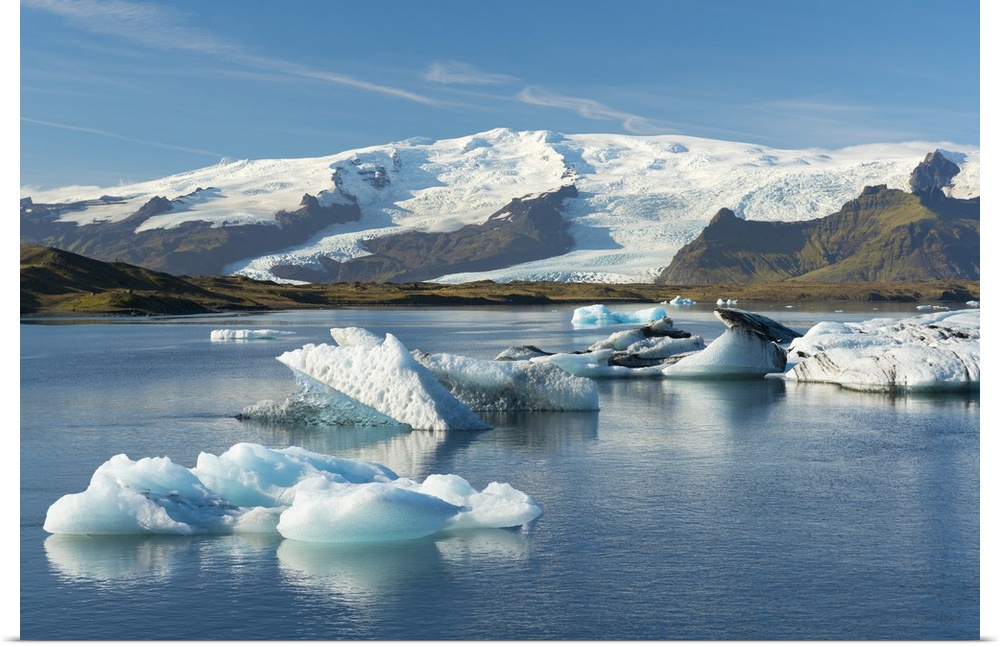 <p>Icebergs floating on Jokulsarlon Glacial Lagoon with Hvannadalshnukur Peak in the background, Iceland, Polar Regions</p>