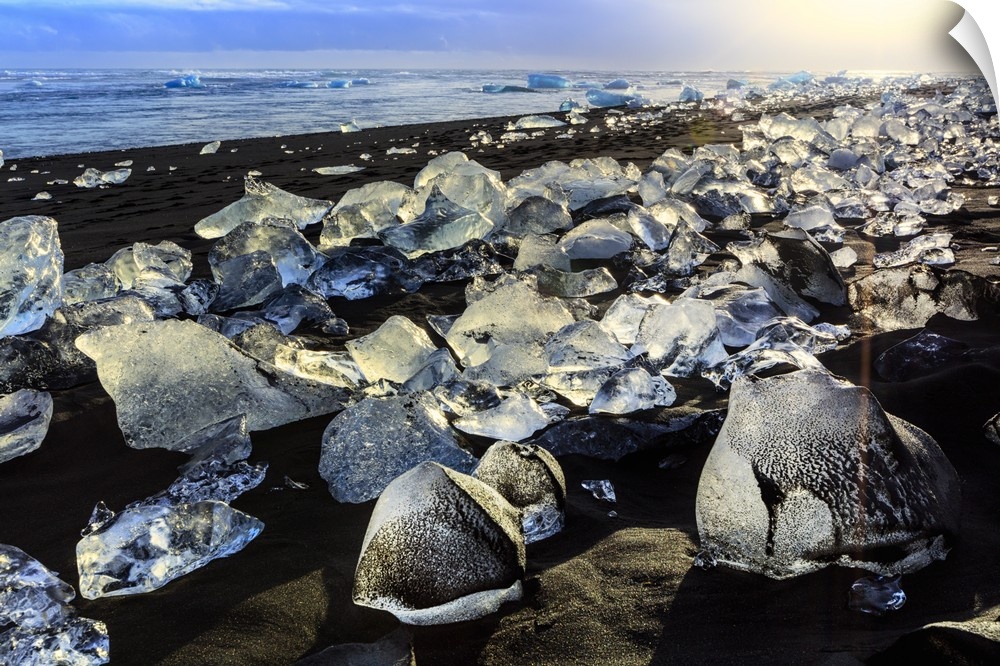 <p>Icebergs on a black sand volcanic beach next to the Jokulsarlon glacial lake in Vatnajokull National Park in southeast Iceland, Polar Regions</p>