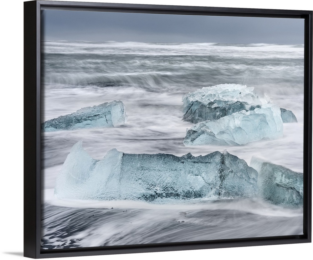 <p>Icebergs on black volcanic beach near the Jokulsarlon glacial lagoon and Breithamerkurjokull glacier in the Vatnajokull National Park, Iceland.</p>