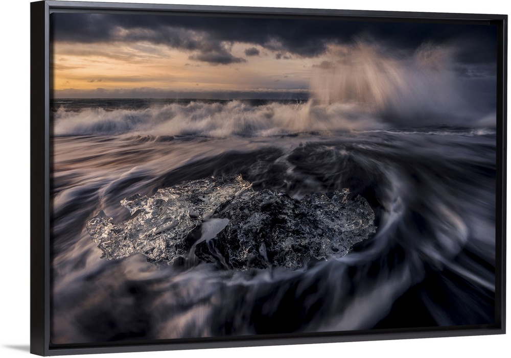 <p>Icebergs stranded on the Breidamerkursandur beach at sunrise in the Vatnajokull National Park, Iceland</p>