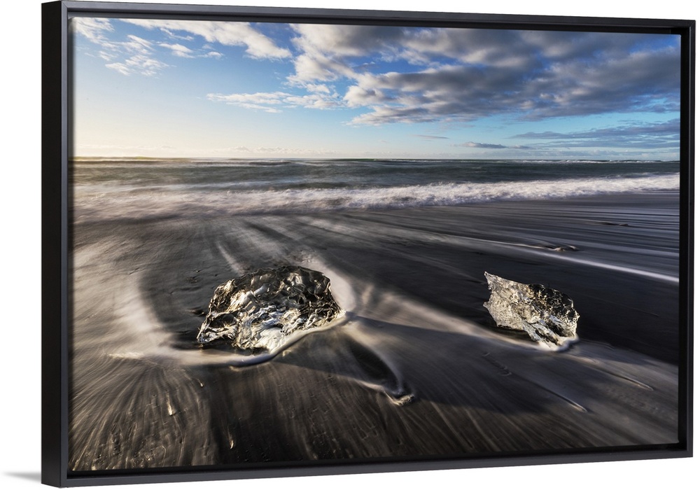 <p>Small icebergs on the beach by Jokulsarlon lagoon, Iceland.</p>