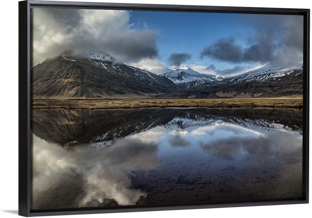 <p>Snow covered mountain reflecting in a lake in Iceland.</p>
