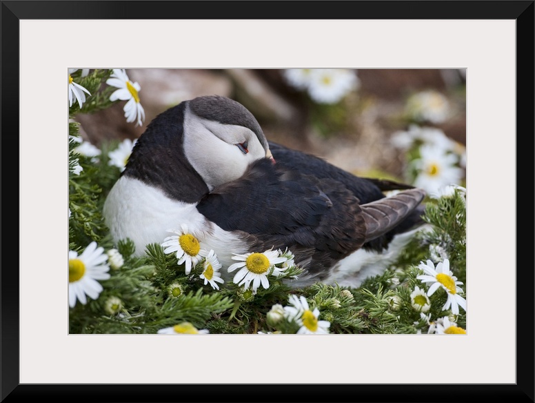 <p>Iceland, Breidavik, Puffin Nesting Among the Daisies.</p>