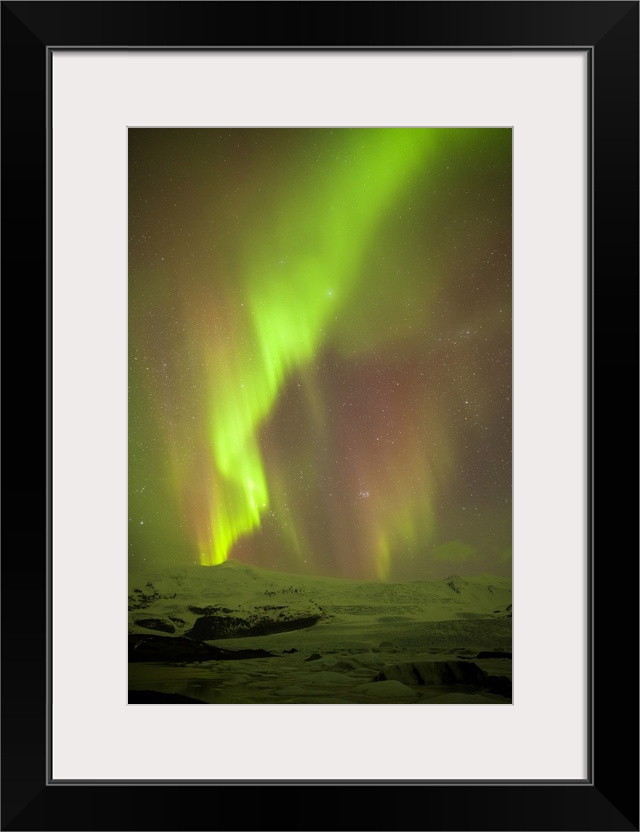 <p>Iceland, Fjallsarlon. The Northern Lights appearing in the sky at Fjallsarlon, a glacier lake at the southern end of the Icelandic glacier of Vatnajokull.</p>