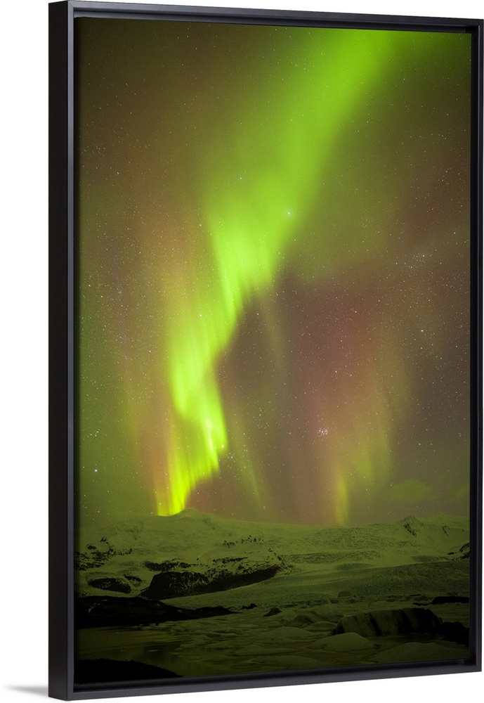 <p>Iceland, Fjallsarlon. The Northern Lights appearing in the sky at Fjallsarlon, a glacier lake at the southern end of the Icelandic glacier of Vatnajokull.</p>
