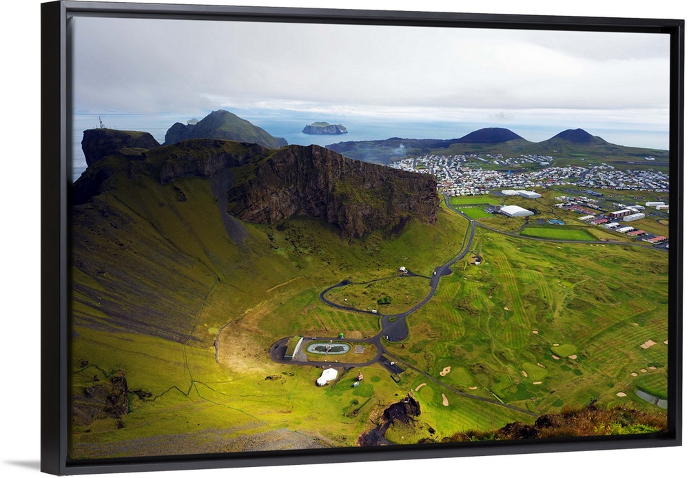 <p>Iceland, Vestmannaeyjar, volcanic Westman Islands, Heimaey Island, golf course in volcanic crater.</p>