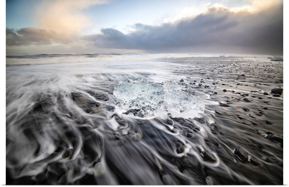 <p>Iceland, South Iceland, Atlantic ocean, Jokulsarlon, Icebergs on the black sandy beach flowing from Jokulsarlon Glacier Lagoon in Vatnajokull National Park.</p>