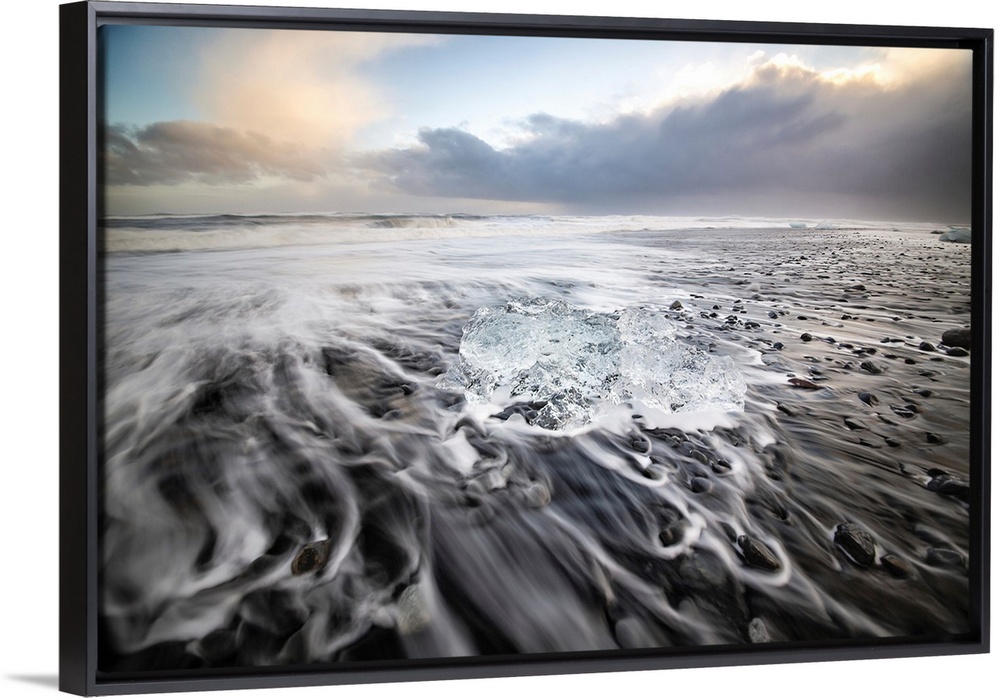 <p>Iceland, South Iceland, Atlantic ocean, Jokulsarlon, Icebergs on the black sandy beach flowing from Jokulsarlon Glacier Lagoon in Vatnajokull National Park.</p>