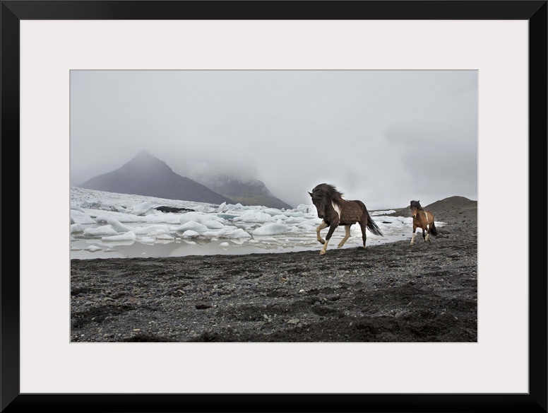 <p>Iceland, South Iceland, Jokulsarlon, Icelandic horses running along the beach by the Breioamerkurjokull icebergs.</p>