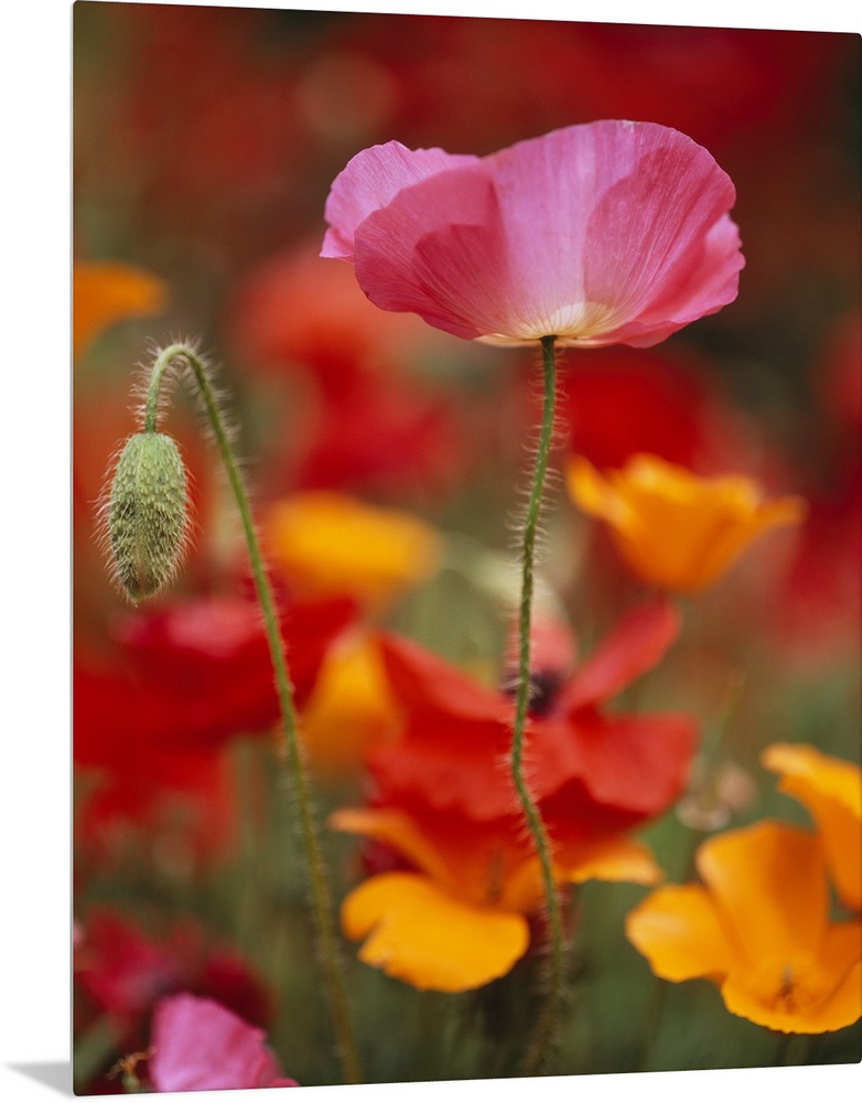 <p>Vertical photograph of a poppy reaching upward in the sunlight, and one bud next to it that has not bloomed yet. The background is a soft focus field of multi-colored poppies and grasses.</p>
