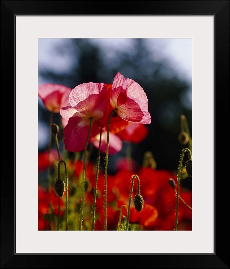 <p>Vertical, big photographic print of a field of poppies. The sun shining through the leaves of several in focus, in the foreground, the background in a soft focus.</p>