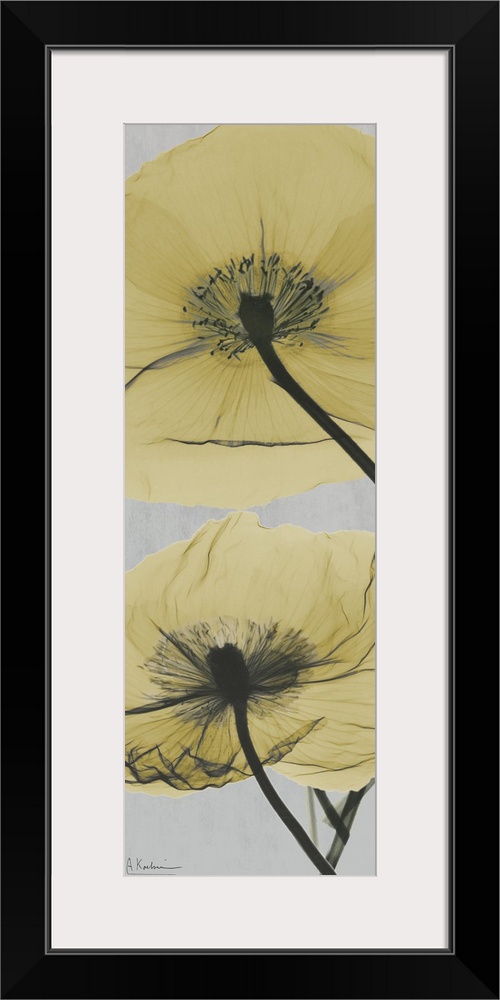 <p>Vertical x-ray photograph of two Icelandic poppies on a cool toned background.</p>