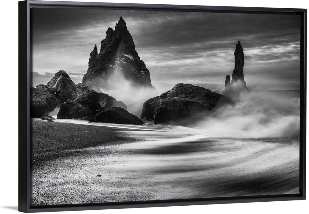 <p>Waves crashing on tall rock spires in Iceland.</p>