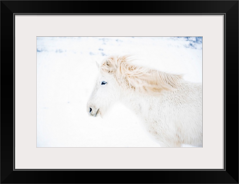 <p>Iceland, West Iceland, Snaefellsnes, Snaefellsnes peninsula, White Icelandic horse in the winter snow.</p>