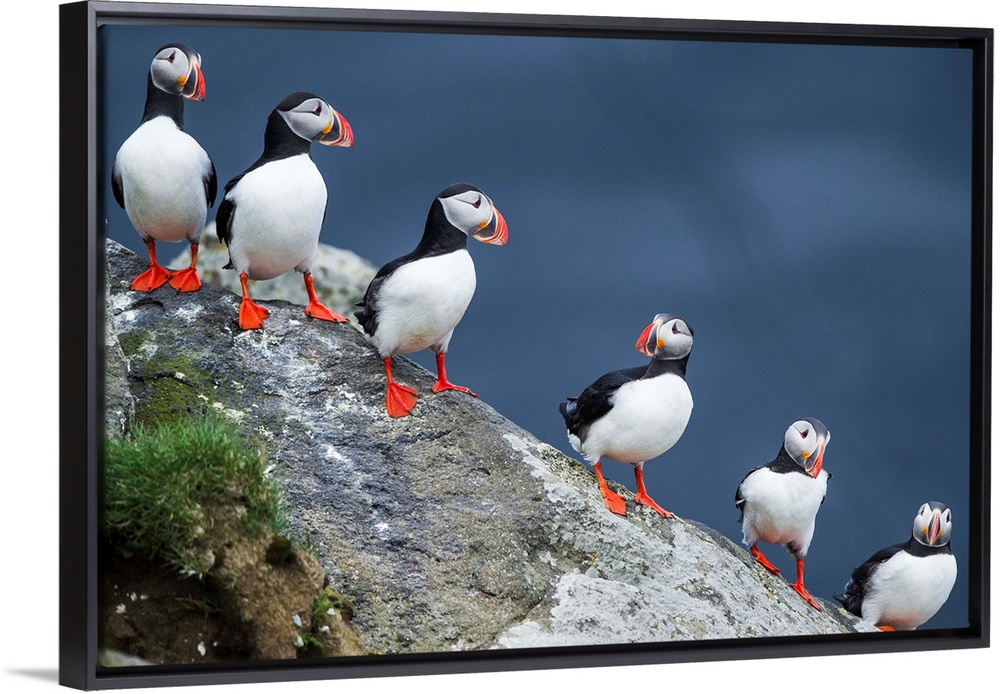 <p>Iceland, South Iceland, Ingolfshofdi, Atlantic puffins in a row.</p>