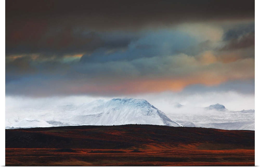 <p>Iceland , West Iceland, Vesturland , Lava fields and snow covered mountains in the last light of day</p>