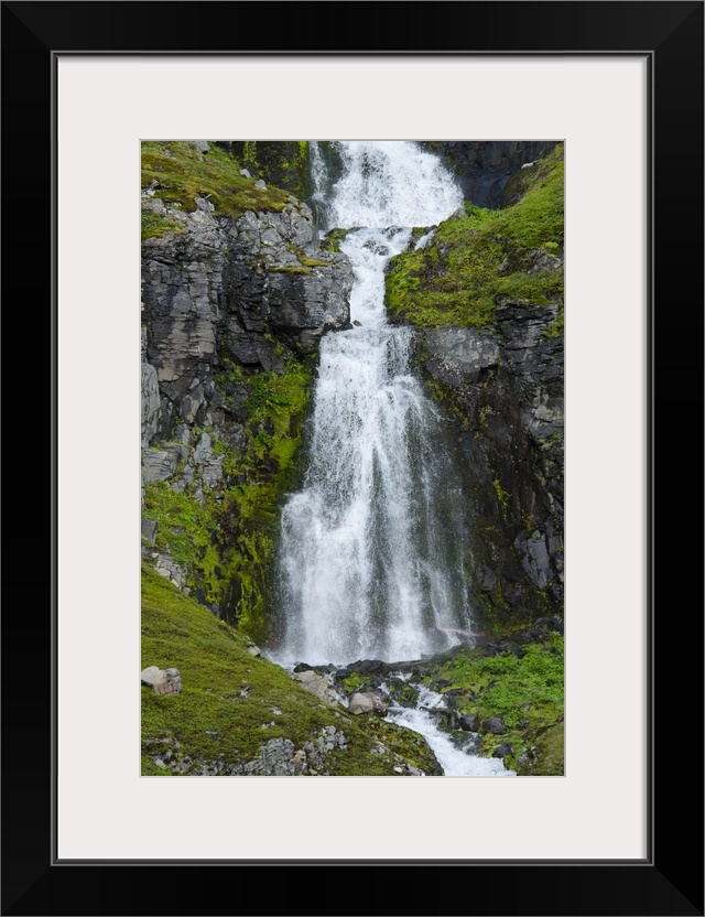 <p>Iceland, Westfjords, Jokulflrdir, Lonagfjordur Nature Reserve. Remote fjord waterfall.</p>