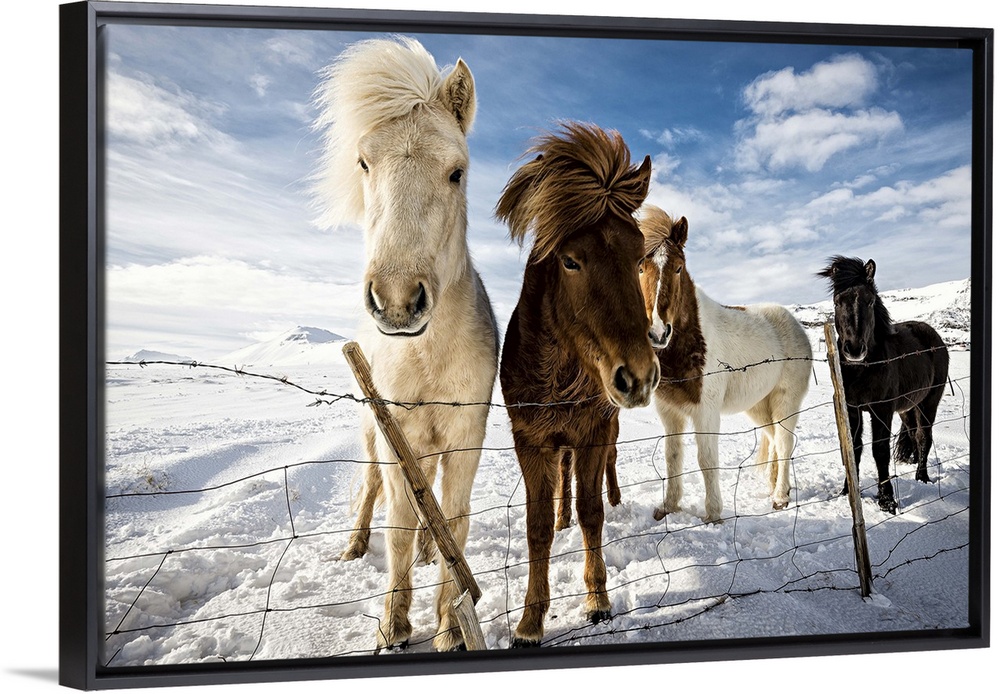 <p>A portrait of Icelandic horses behind a fence in winter.</p>
