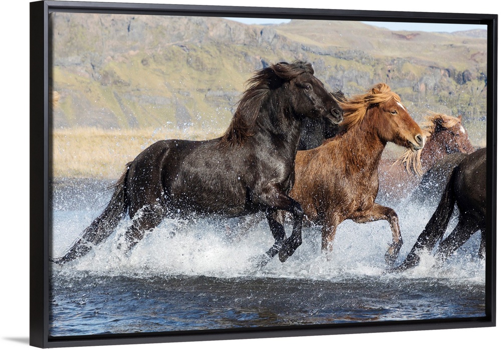 <p>Icelandic Horses Running Across A Glacial River, South Iceland.</p>