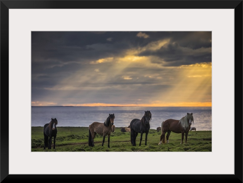 <p>Icelandic horses standing in a row on the shore at sunset; Hofsos, Iceland</p>