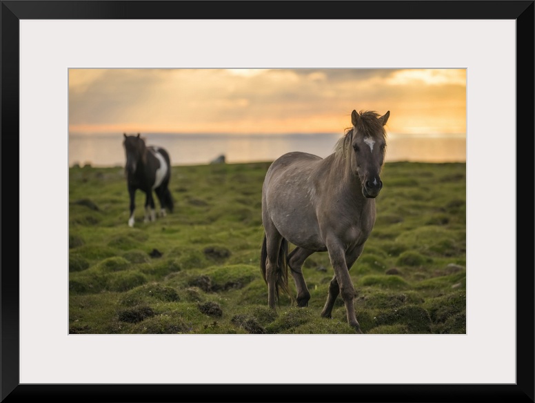 <p>Icelandic horses walking along the ocean at sunset; Hofsos, Iceland</p>