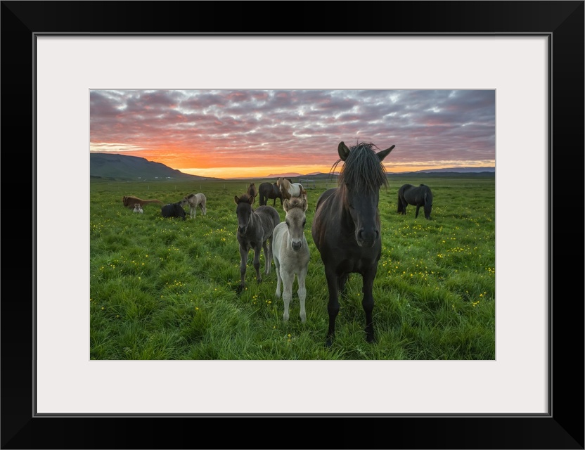 <p>Icelandic horses walking in a grass field at sunset, Hofsos, Iceland</p>