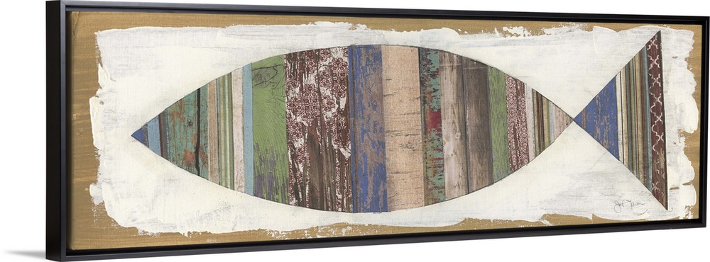 <p>A painting of a fish with patterned horizontal stripes on a white and tan background.</p>