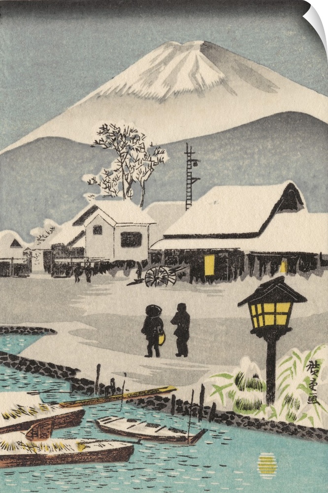 <p>Eastern art of snowy village scene with Mount Fuji in the background.</p>