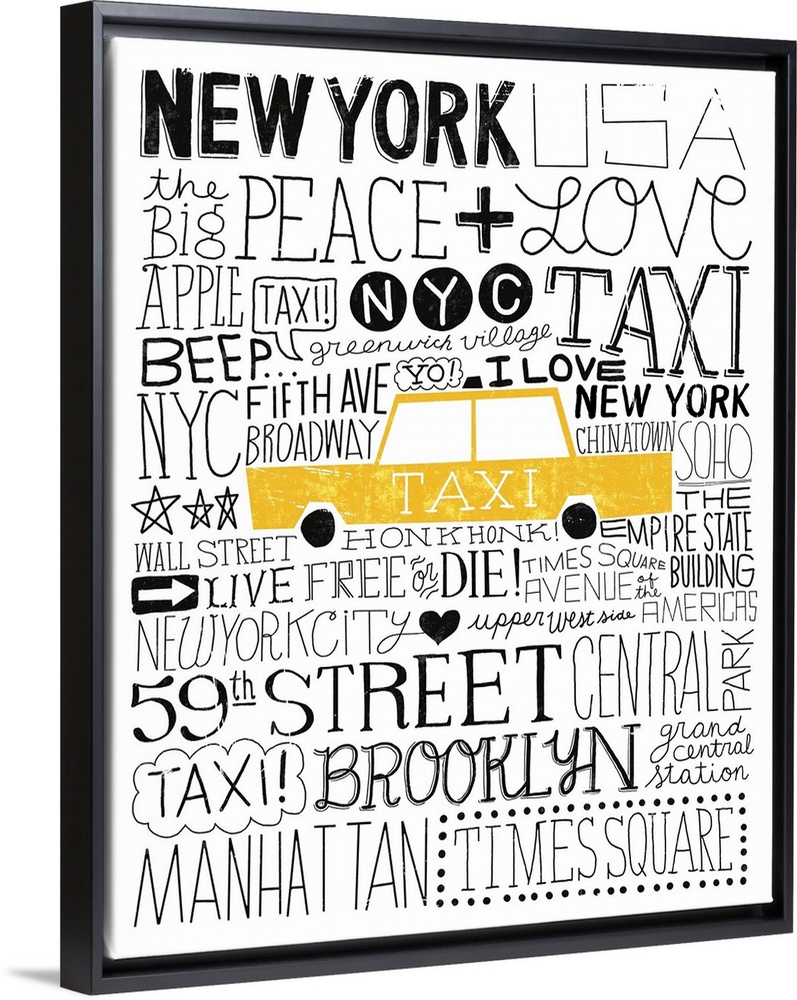 <p>A creative design of a yellow taxi cab with words related to the city of New York all around it.</p>