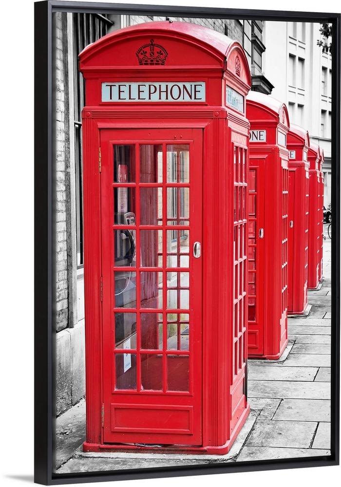 <p>Row of iconic London red phone cabins with the rest of the picture in black and white</p>