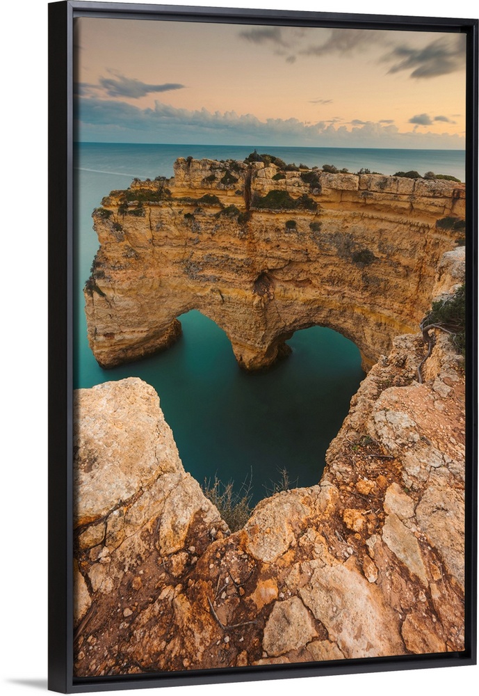 <p>Iconic rock formation, Arcos Naturais, Heart of the Algarve, and the turquoise water of the Atlantic Ocean at Praia da Marinha along the Atlantic coast in Caramujeira, part of the Lagoa Municipality, at sunset, Algarve, Faro District, Portugal</p>