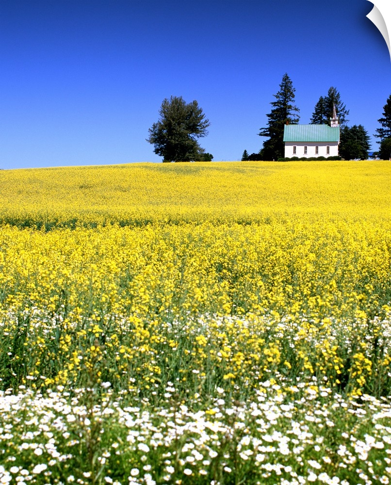 <p>Landscape photograph of a field filled with white and yellow wildflowers and a church on a hill in the distance.</p>