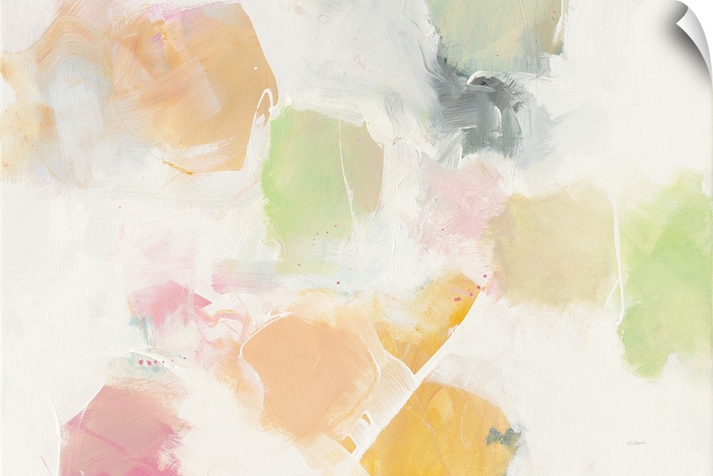 <p>Large abstract art with soft blotches of green, pink, orange, and yellow hues on a grey and white background.</p>