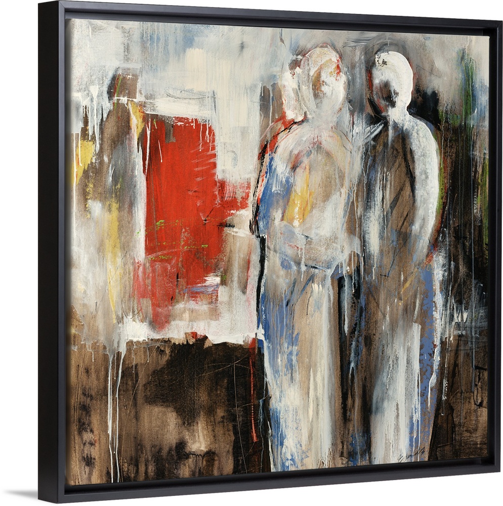 <p>An abstract painting of two figures in neutral colors with pops of red.</p>