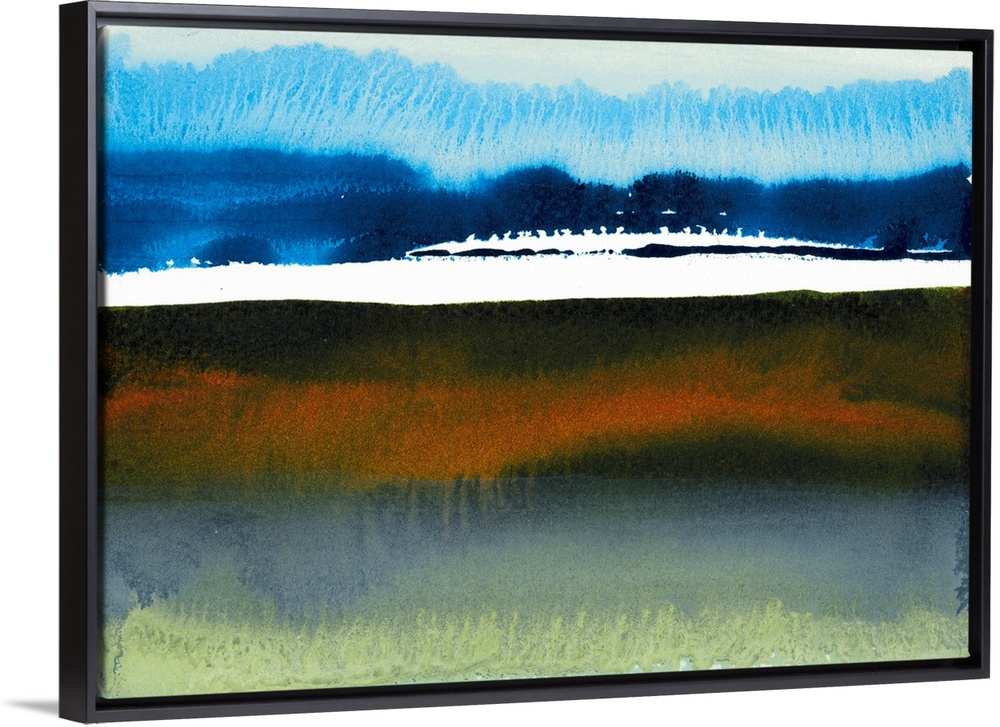 <p>Abstract watercolor landscape featuring layered bands of blue sky, white horizon, dark earth, warm orange field, and cool green foreground, evoking a serene, atmospheric vista.</p>