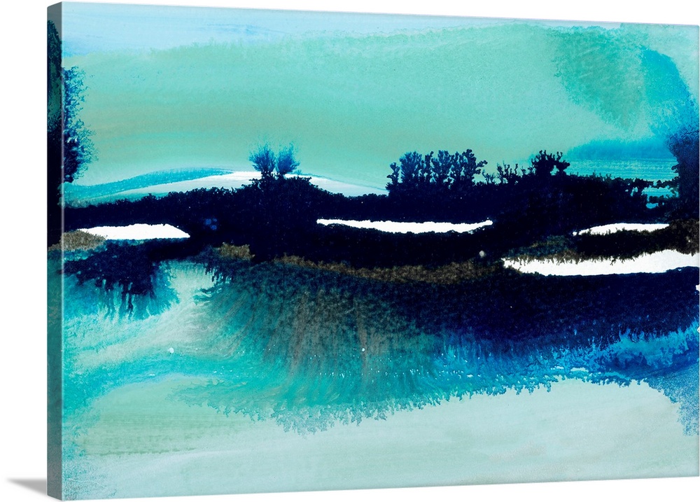 <p>An abstract, fluid landscape painting in a cool palette of deep blues, turquoises, and white, evoking a serene waterscape with silhouetted landforms.</p>