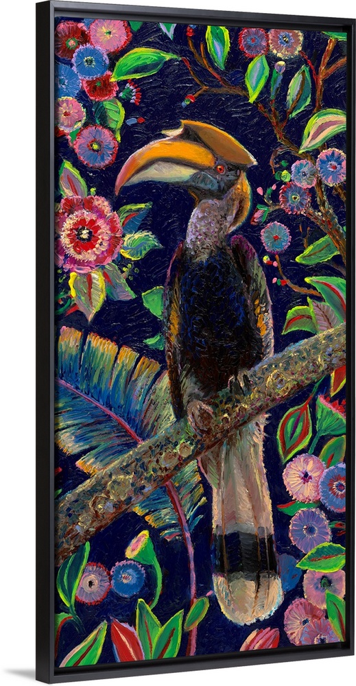 <p>Brightly colored contemporary artwork of a horned toucan in a tree.</p>