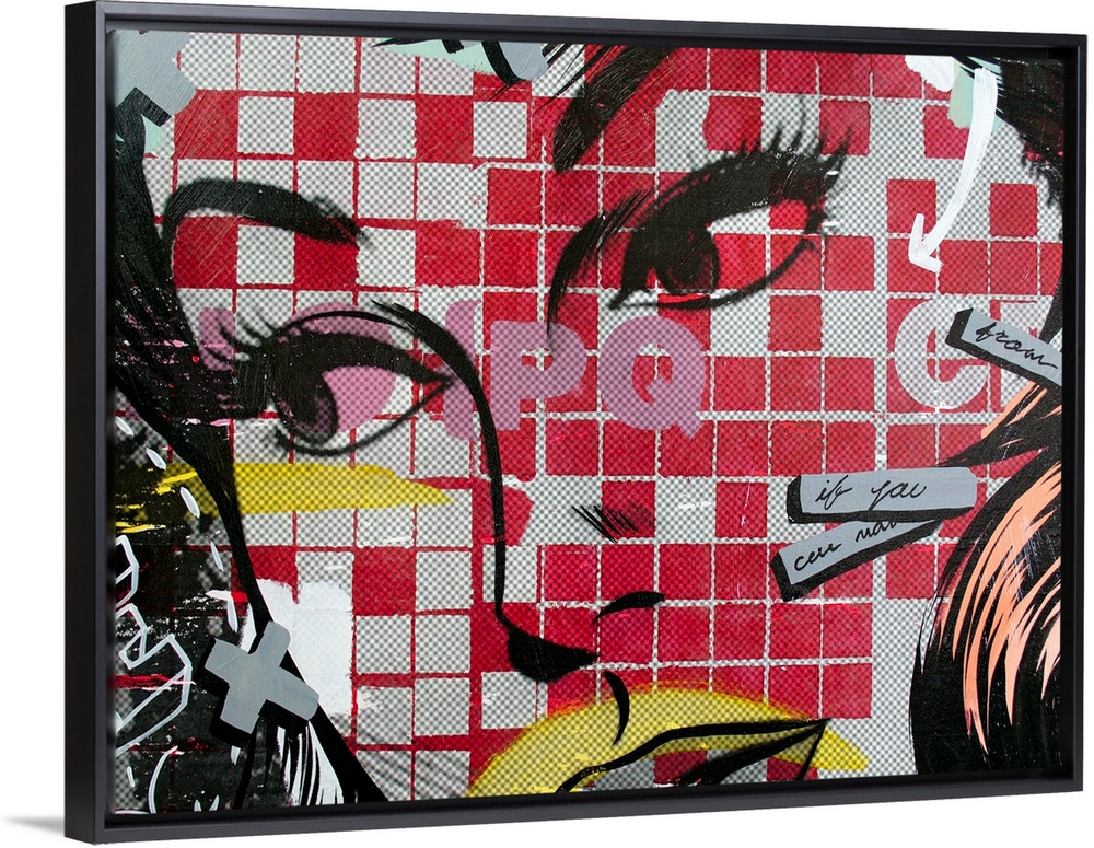<p>Pop art composed of comic illustrations and bold text, reminiscent of Lichtenstein, of a close-up of a woman's face with red tiles.</p>