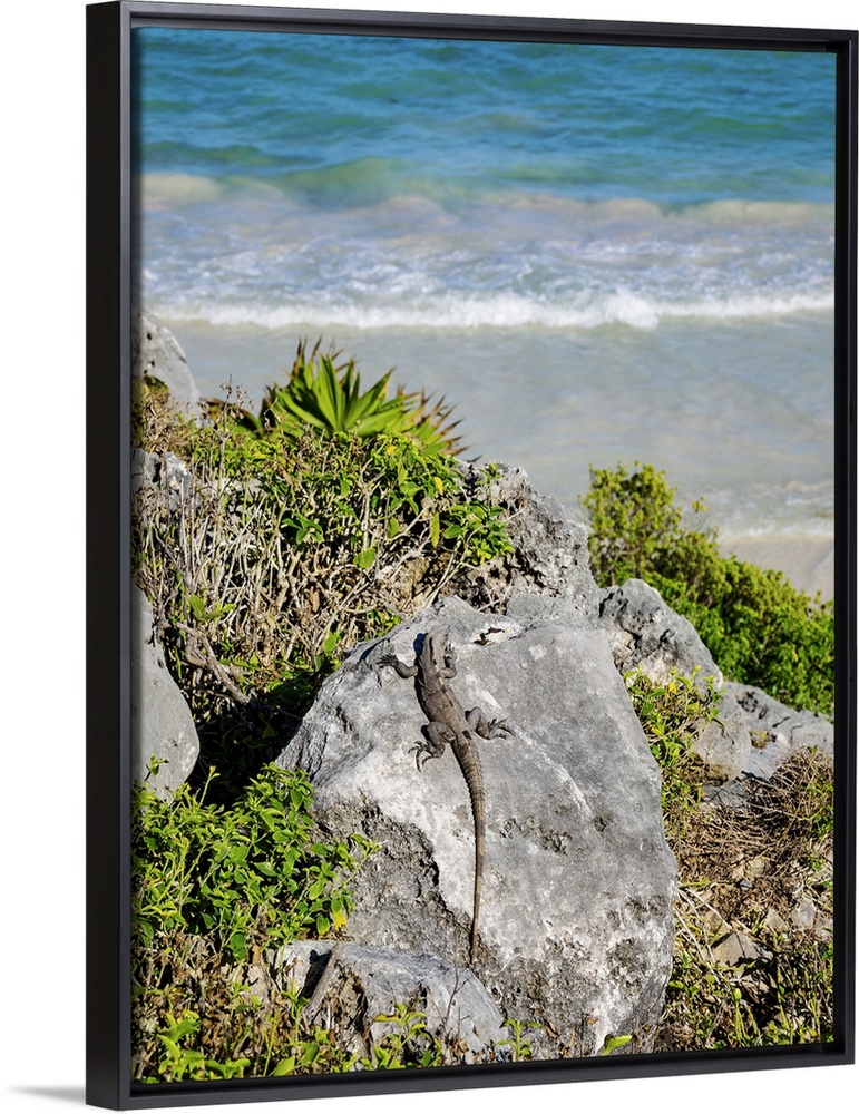 <p>Iguana at the rock with Caribbean Sea in the background, Paradise Beach, Tulum, Quintana Roo State, Mexico</p>