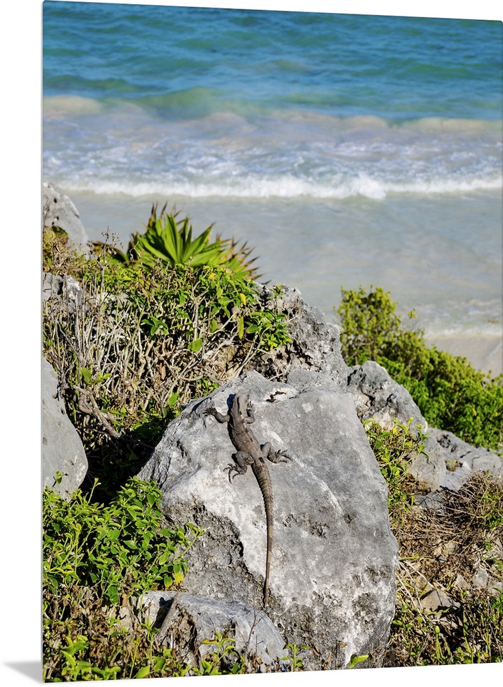 <p>Iguana at the rock with Caribbean Sea in the background, Paradise Beach, Tulum, Quintana Roo State, Mexico</p>