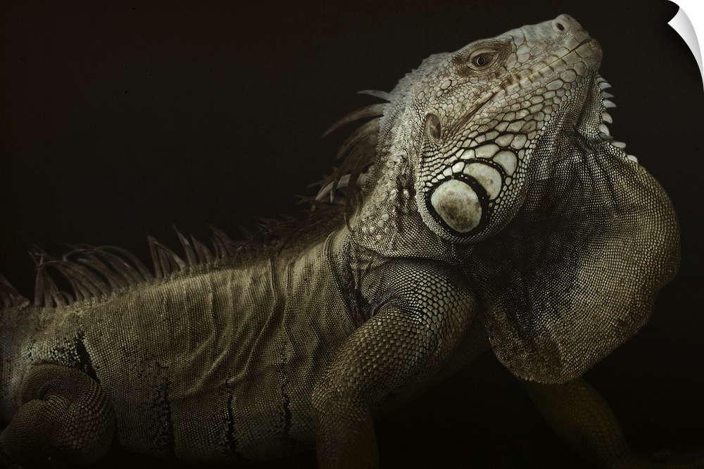 <p>Portrait of a large iguana on a black background.</p>