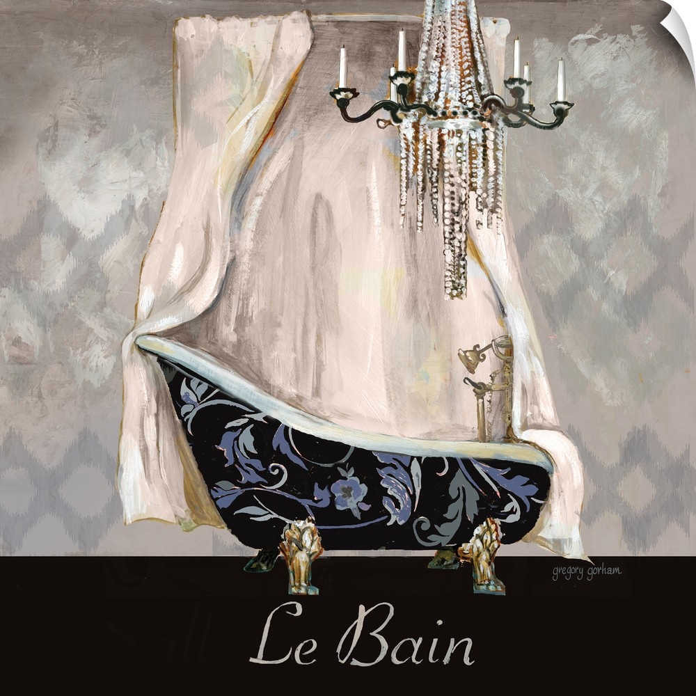 <p>Square painting of a floral print clawfoot bathtub with a chandelier and "Le Bain" written on the bottom.</p>