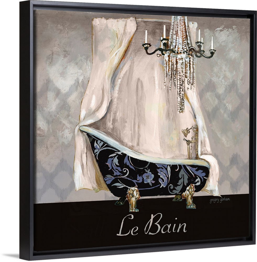 <p>Square painting of a floral print clawfoot bathtub with a chandelier and "Le Bain" written on the bottom.</p>