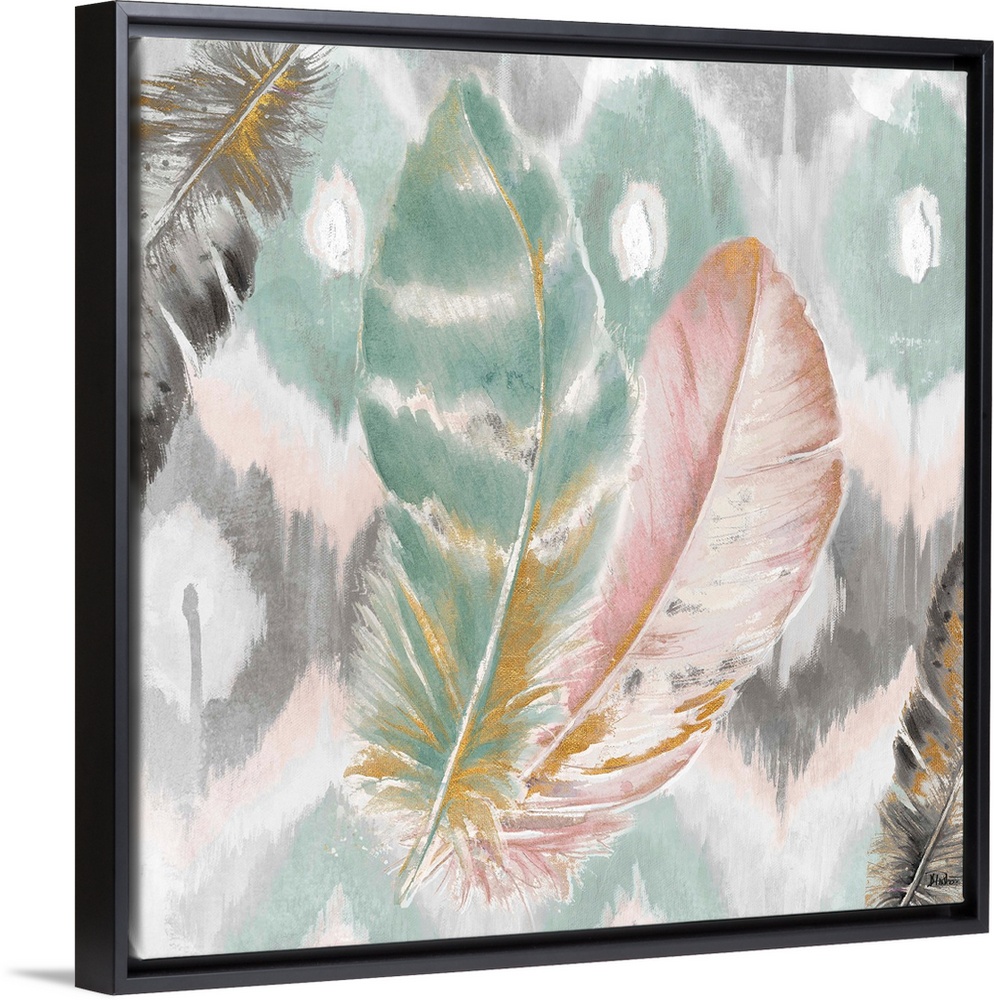 <p>A watercolor painting of four feathers with a teal, pink, gold, black, and white ikat design.</p>