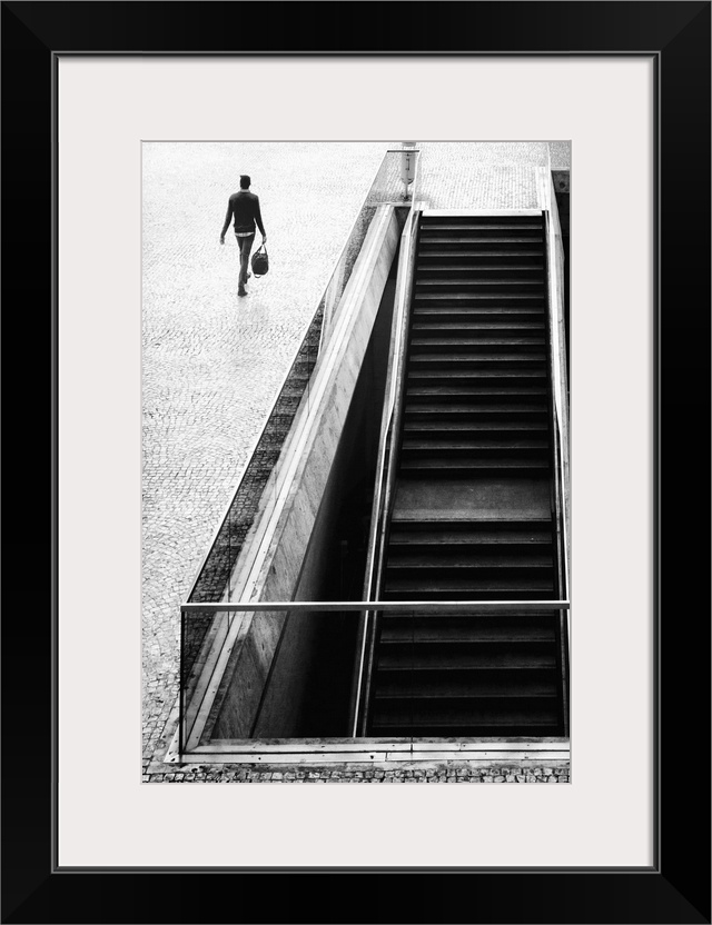 <p>A man walking past a staircase leading underground.</p>