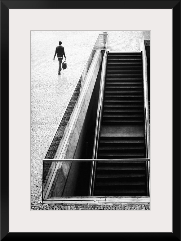 <p>A man walking past a staircase leading underground.</p>